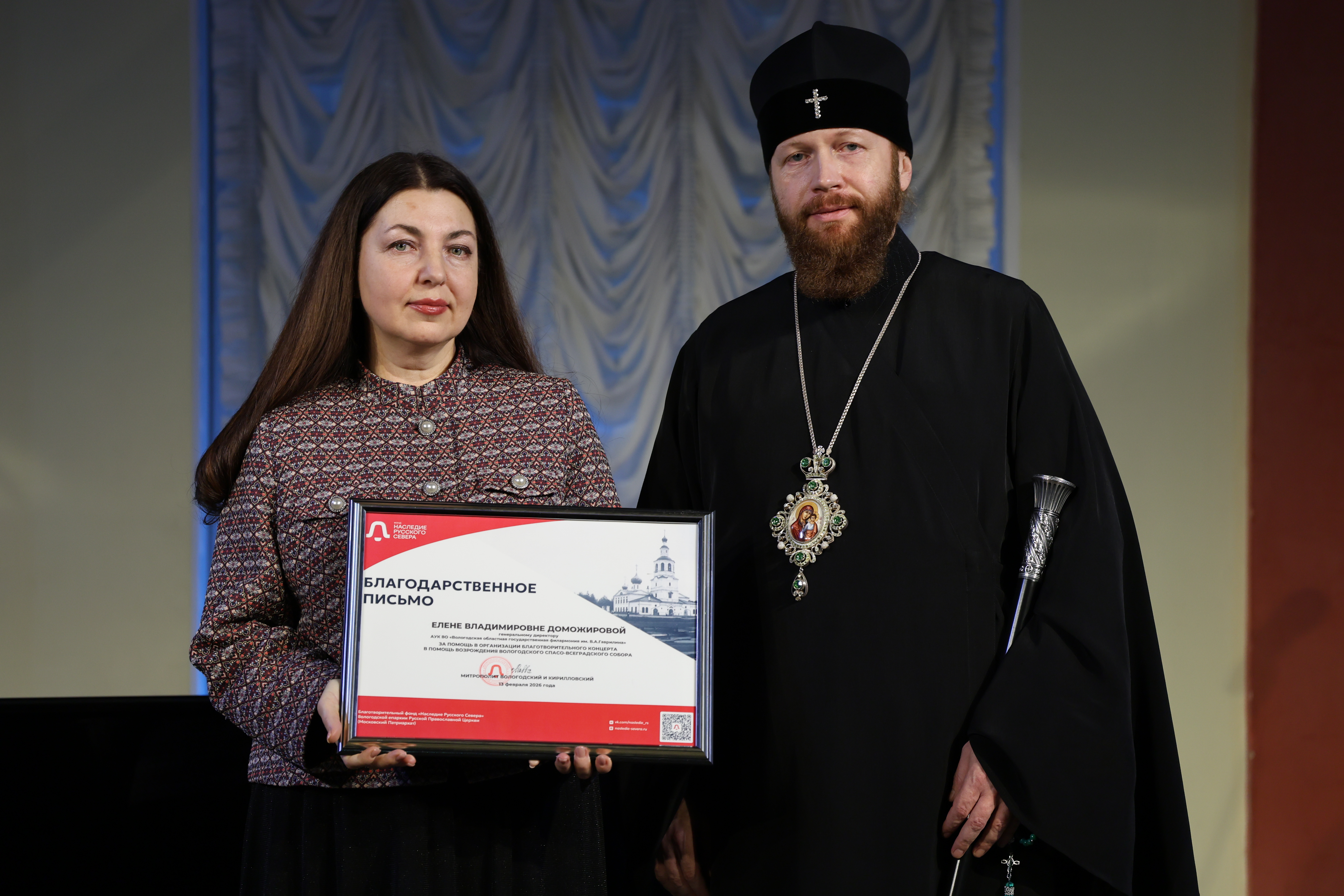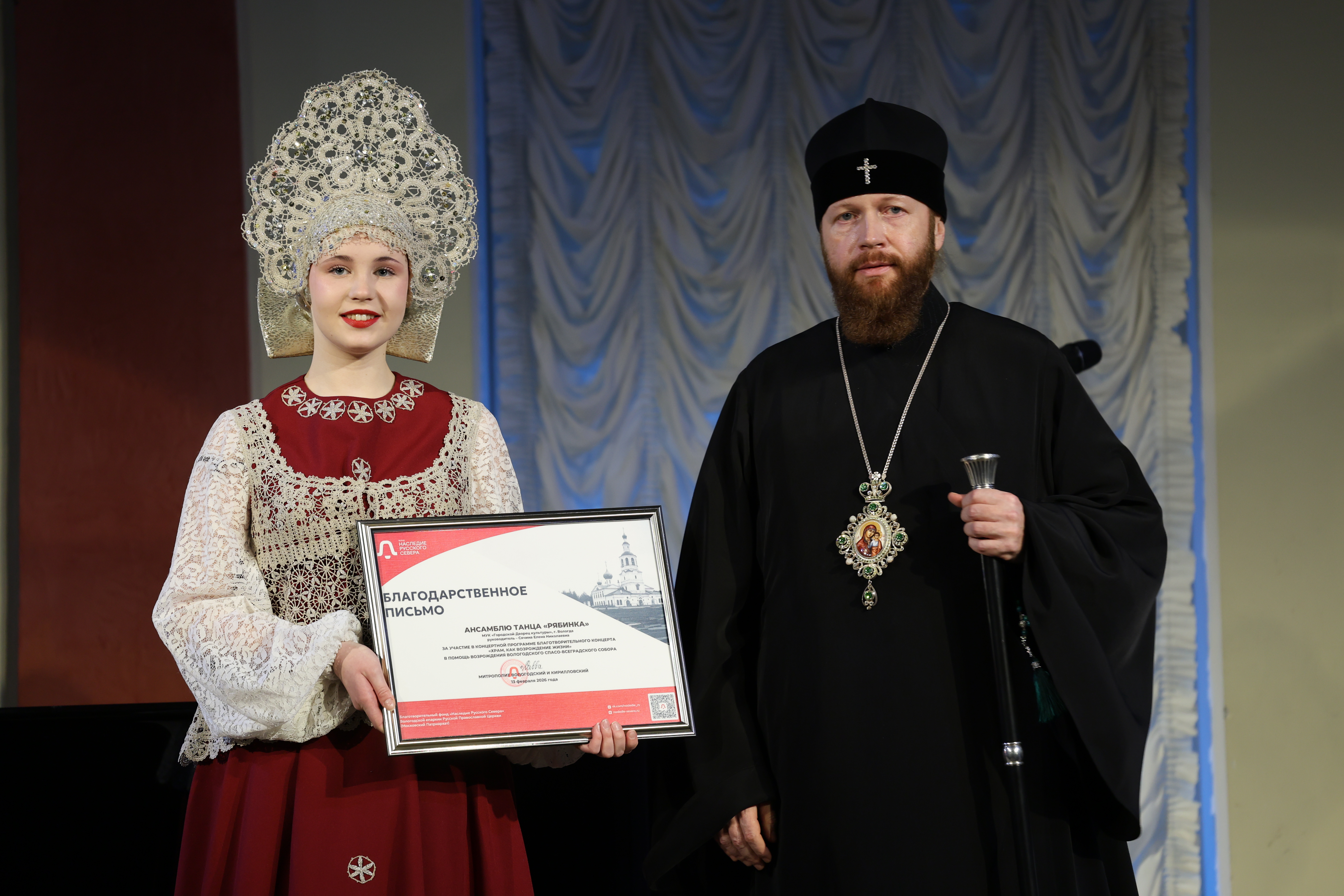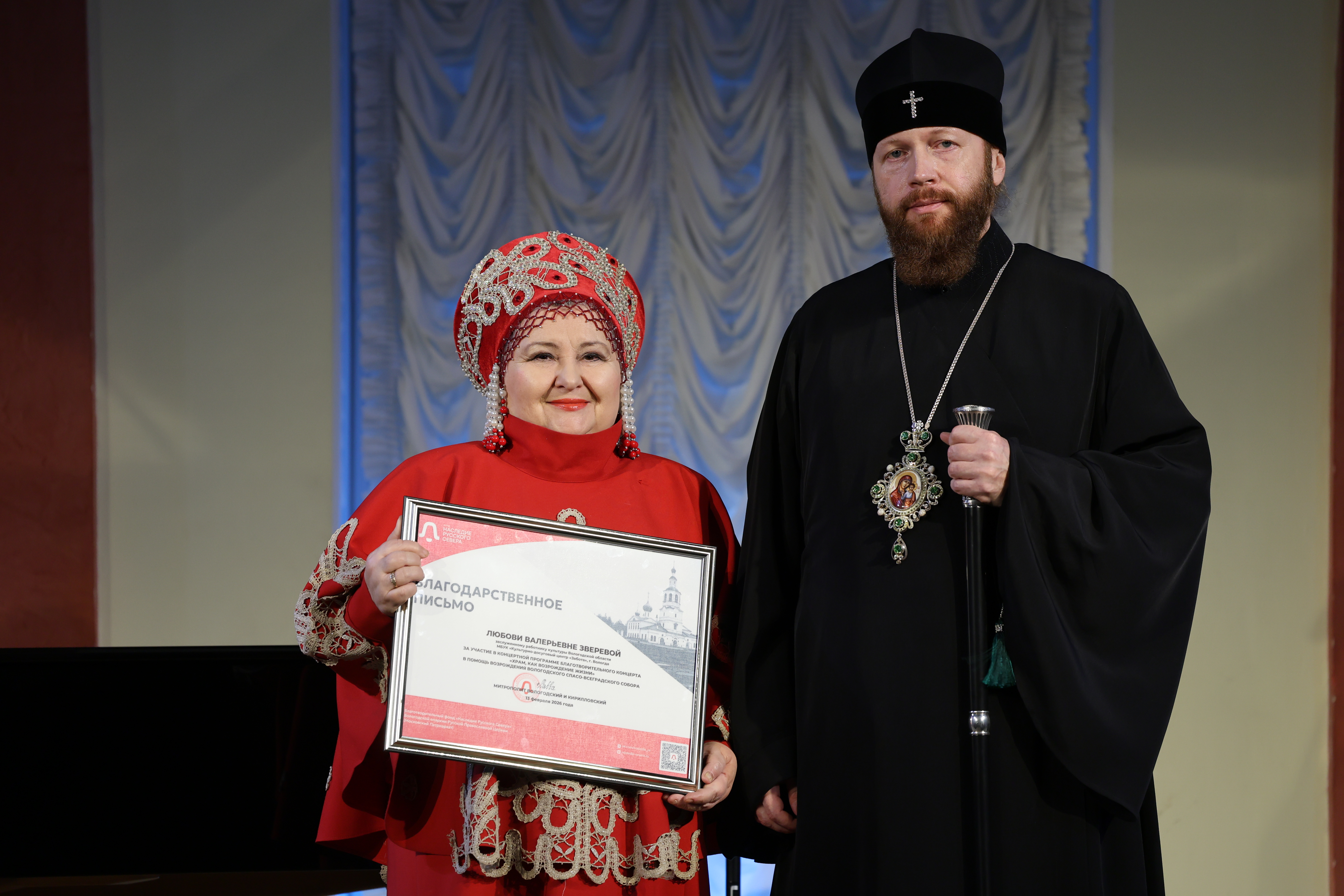 Завершили концерт заслуженный работник культуры Вологодской области Любовь Зверева и ансамбль народного танца «Рябинка» песней «Милый город мой Вологда». Все участники вечера получили благодарственные письма от митрополита Вологодского и Кирилловского Саввы.
